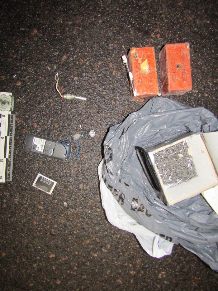 При задержании в его автомобиле был обнаружен профессиональный фотоаппарат, три мобильных телефона и документы. Также в ходе обыска были изъяты пакет с взрывным устройством с тремя тротиловыми шашками.