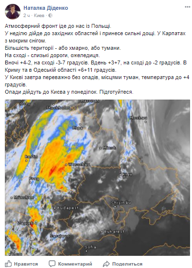 В воскресенье, 26 ноября, по прогнозам синоптиков атмосферный фронт обусловит дождь и мокрый снег, в некоторых регионах будет туман. Температура в столице поднимется до +5 градусов. Об этом сообщила синоптик Наталья Диденко в Facebook.