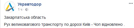 "Движение большегрузного транспорта по дороге Киев - Чоп возобновлено", - говорится в сообщении.