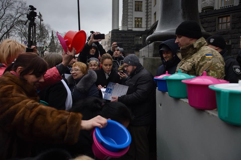"Сегодня 1000 женщин пришли под стены Кабинета министров с предупредительной акцией "Слить правительство в горшок". Участницы Национальной платформы "Женщины за Мир", мягко говоря, не довольны результатами работы Кабинета министров и по-своему выразили протест против его действий – забросали здание Правительства пустыми детскими горшками, которые символизируют непрофессионализм, который министры демонстрирую в управлении страной", - отметила инициатор Национальной платформы "Женщины за Мир" Наталья Королевская.