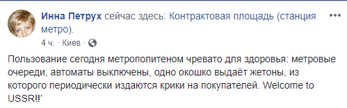 "Пользование сегодня метрополитеном чревато для здоровья: метровые очереди, автоматы выключены, одно окошко выдаёт жетоны, из которого периодически издаются крики на покупателей. Welcome to USSR!"? - написала пользовательница Инна Петрух.