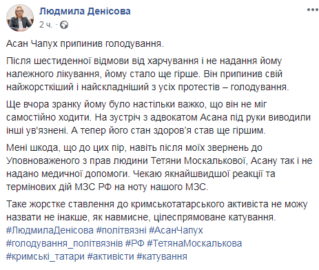 Арестованный российскими силовиками крымский татарин Асан Чапух прекратил голодовку из-за стремительного ухудшения состояния здоровья. Об этом на своей странице в Facebook сообщила уполномоченный Верховной Рады по правам человека Людмила Денисова.