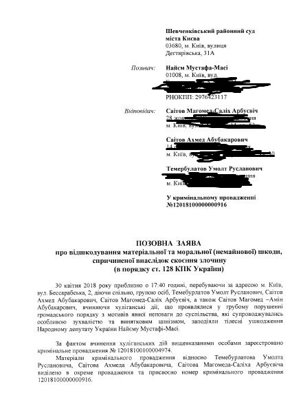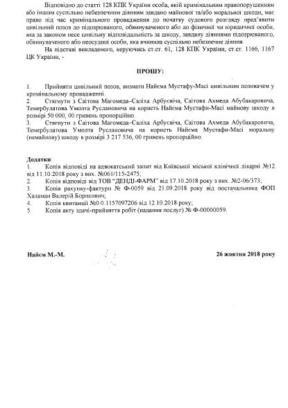 "Мы действительно подали гражданский иск в рамках уголовного дела против троих нападавших на Мустафу, но гражданский иск в рамках уголовного - это о возмещении ущерба, нанесенного моему брату уголовным преступлением", - сказал Маси Найем. По его словам, иск о компенсации это только часть претензий к напавшим.
