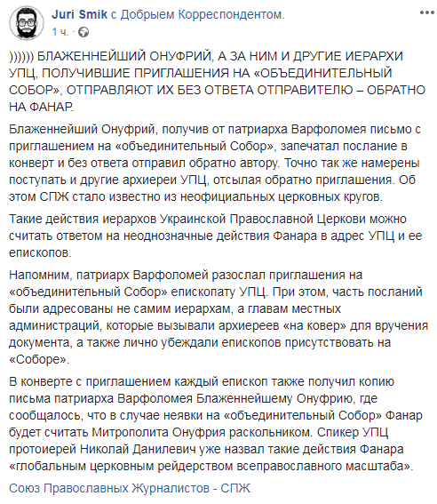 Предстоятель Украинской православной церкви (МП) митрополит Онуфрий отправил письмо с приглашением на "объединительный Собор" обратно главе Константинопольского патриархата Варфоломею. Он запечатал послание в конверт и оставил его без ответа, отправив письмо обратно на Фанар, стамбульский квартал, где находится нынешняя резиденция Варфоломея.