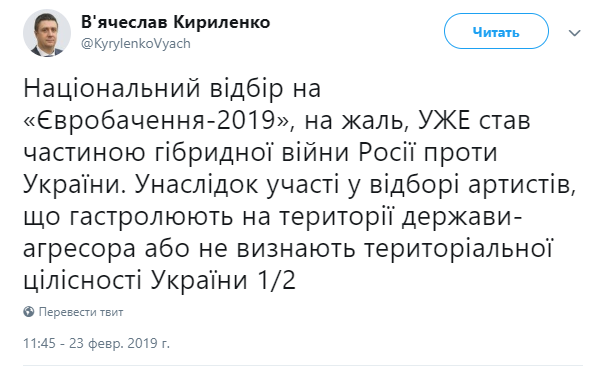 Вице-премьер-министр Украины Вячеслав Кириленко заявил, что Национальный отбор на Евровидение 2019 стал "частью гибридной войны России против Украины". Об этом он написал на своей странице в Twitter.