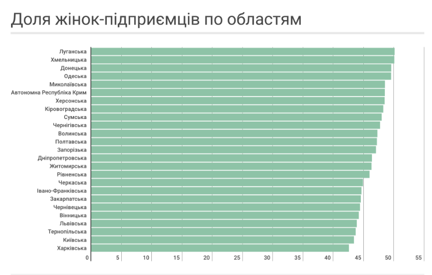 Больше всего женщин работают как предприниматели в Хмельницкой (50%) и Одесской областях (49.5%). На третьем месте Николаевская область - 48.5%.