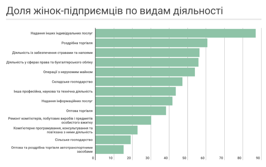 Также женщины работают как физические лица-предприниматели и преимущественно занимаются комплексным обслуживанием объектов, государственным управлением и деятельностью общественных организаций. Женщины являются владельцами 35% украинских компаний.