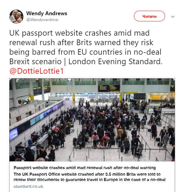 Веб-ресурс британского Паспортного отдела Ее Величества во вторник, 12 марта, не выдержал нагрузки и перестал работать после того, как 3,5 млн жителей страны одновременно решили обновить документы, чтобы быть уверенными в возможности выехать в Европу, если сделка по Brexit не будет принята, передает Evening Standart