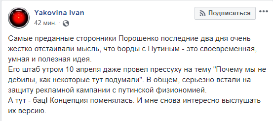 "Самые преданные сторонники Порошенко последние два дня очень жестко отстаивали мысль, что борды с Путиным - это своевременная, умная и полезная идея. Его штаб утром 10 апреля даже провел прессуху на тему "Почему мы не дебилы, как некоторые тут подумали". В общем, серьезно встали на защиту рекламной кампании с путинской физиономией. А тут - бац! Концепция поменялась. И мне снова интересно выслушать их версию", - пишет журналист.