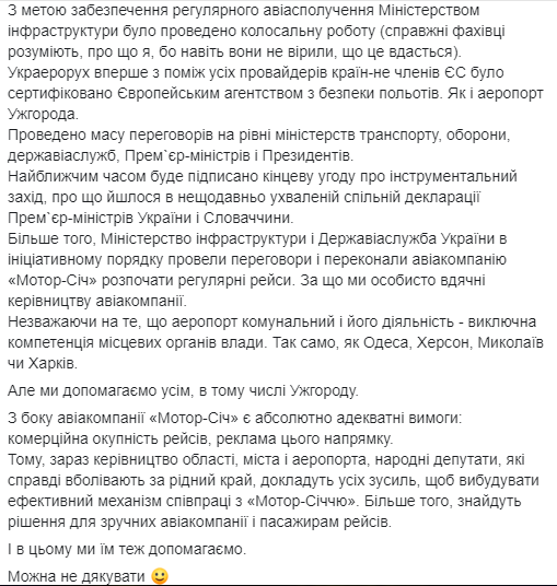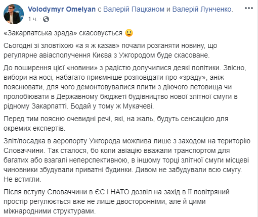 Министр инфраструктуры Владимир Омелян также отметил на своей странице в Facebook, что "Закарпатська зрада" отменяется. А Украина и Словакия намерены определить условия использования части воздушного пространства Словакии для выполнения полетов из аэропорта "Ужгород".
