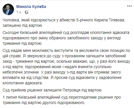 Во вторник, 25 июня, в Киевском апелляционном суде рассматривали ходатайство защиты об изменении избранной меры пресечения в виде содержания под стражей для подозреваемого в убийстве 5-летнего Кирилла Тлявова в Переяслав-Хмельницком Киевской области. Об этом на своей странице в Facebook сообщил уполномоченный президента Украины по правам ребенка Николай Кулеба.