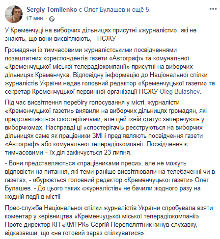 В день выборов, 21 июля, в Кременчуге Полтавской области на участках присутствуют псевдожурналисты, которые показывают временные удостоверения газеты "Автограф" и коммунальной "Кременчугской городской телерадиокомпании". Об этом в Facebook сообщил глава НСЖУ Сергей Томиленко.