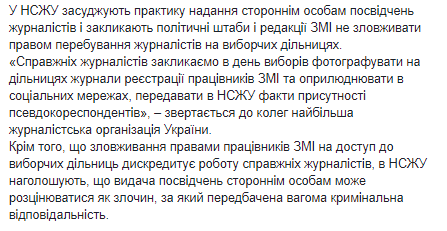 В НСЖУ осуждают практику предоставления сторонним лицам удостоверений журналистов и призывают политические штабы и редакции СМИ не злоупотреблять правом пребывания журналистов на избирательных участках. Кроме того, за массовую выдачу журналистских удостоверений редакторы СМИ могут понести уголовную ответственность.