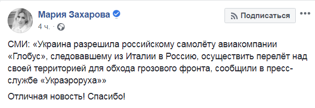 "СМИ: "Украина разрешила российскому самолёту авиакомпании "Глобус", следовавшему из Италии в Россию, осуществить перелёт над своей территорией для обхода грозового фронта, сообщили в пресс-службе "Украэроруха". Отличная новость! Спасибо!" - написала представитель российского МИД.