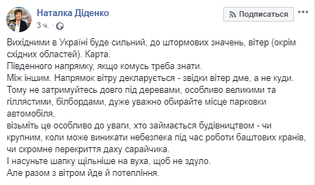 "Возьмите это особо во внимание, кто занимается строительством - или крупным, когда может возникать опасность во время работы башенных кранов, или скромное перекрытие крыши сарайчика. И надвиньте шапку плотнее на уши, чтобы не сдуло", - написала синоптик.