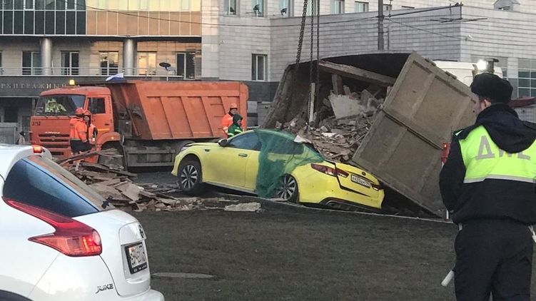 В центре Москвы мусорный контейнер раздавил такси. Фото