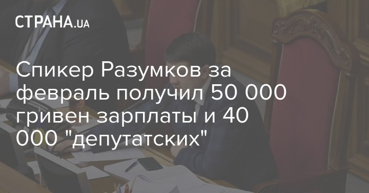 Зарплата Разумкова за февраль составила 50 448 гривен. Его первый зам Руслан Стефанчук получил в феврале 59 223,85 гривны, а зам Елена Кондратюк - 47 452,65 гривны. Кроме того, Разумкову, Стефанчуку и Кондратюк в феврале было начислено по 42 040 гривен на выполнение депутатских полномочий за январь.