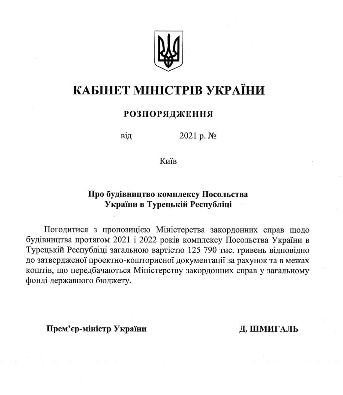 "Согласиться с предложением Министерства иностранных дел относительно строительства в течение 2021 и 2022 года комплекса Посольства Украины в турецкой Республике общей стоимостью 125 790 тыс. гривен в соответствии к утвержденной проектно-сметной документации за счет и в границах средств, которые предусмотрены Министерства иностранных дел в общем фонде госбюджета", - говорится в документе.