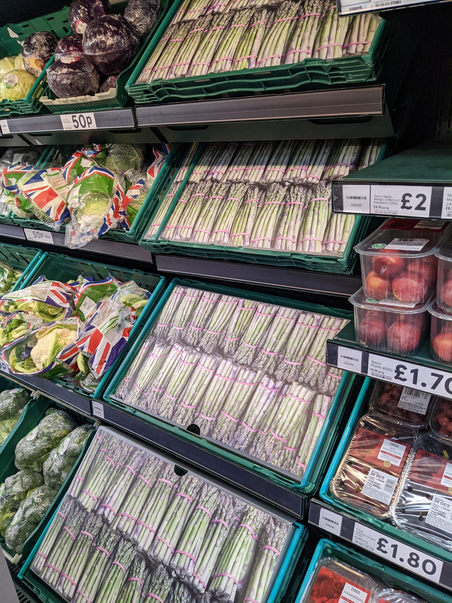 Доходит до смешного - в некоторых супермаркетах Британии пустые полки прикрывают фотографиями овощей. Например, крупнейшая розничная сеть Tesco начала закрывать пустые прилавки в своих магазинах "картонными" спаржей, морковью, апельсинами и виноградом, что уже вызвало троллинг в соцсетях.