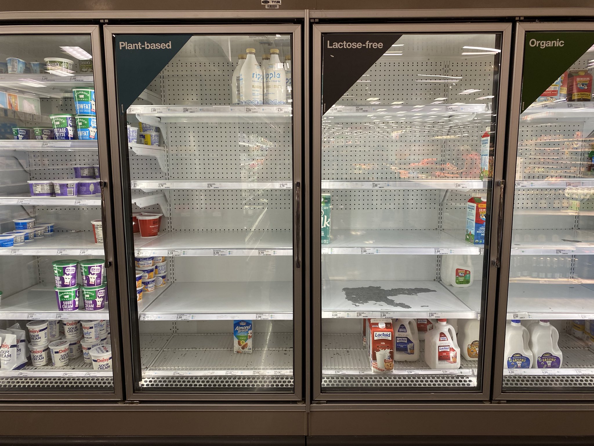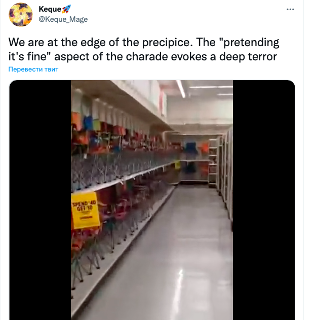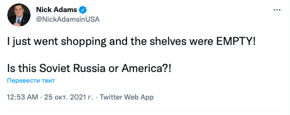 "Я вышел за покупками, а тут пустые полки в магазине! Мы в Советской России или в Америке?!" - написал в Twitter американский писатель, "трампист" Ник Адамс.