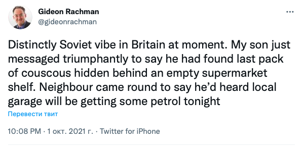 "Британия сейчас чувствует себя как Советский Союз. Мой сын только что торжествующе просигналил, что нашел последнюю упаковку кускуса за пустой полкой супермаркета. С другой стороны, сосед пришел сказать, что слышал, что на местной заправке сегодня будет мало топлива",- пишет в своем Twitter Гидеон Рахман, обозреватель Financial Times.