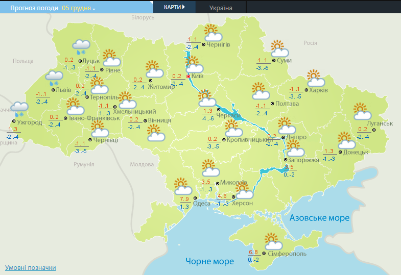 По данным синоптиков, завтра ночью, 5 декабря, в юго-восточной части страны будет мокрый снег. В западных областях также ожидается небольшой мокрый снег с дождем, а на дорогах местами гололедица. При этом на остальной территории Украины без осадков.