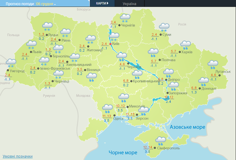 "Временами дождь и мокрый снег, местами налипание мокрого снега, на дорогах гололедица; на юге и в центральных областях дождь, местами туман. Температура в западной части ночью и днем около 0 градусов, в Карпатах -2...-8 градусов мороза. В северных областях постепенное повышение температуры ночью и днем до +1...+5 градусов тепла, на остальной территории ночью +3...+8 градусов тепла, днем до +6...+12 градусов, на юге местами до +16 градусов", — сообщили в Укргидрометцентре.