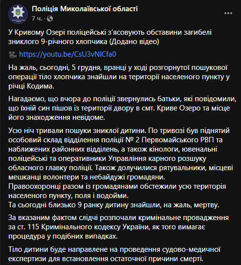 В пгт Николаевской области обнаружили тело пропавшего 9-летнего мальчика. Фото: Нацполиция