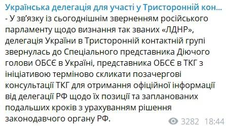 "В связи с сегодняшним обращением российского парламента о признании так называемых "ЛДНР", делегация Украины в Трехсторонней контактной группе обратилась к Специальному представителю Действующего председателя ОБСЕ в Украине, представителю ОБСЕ в ТКГ с инициативой срочно созвать внеочередные консультации ТКГ для получения официальной информации делегации РФ по поводу их позиции и дальнейших шагов на базе решения законодательного органа РФ", - говорится в сообщении.