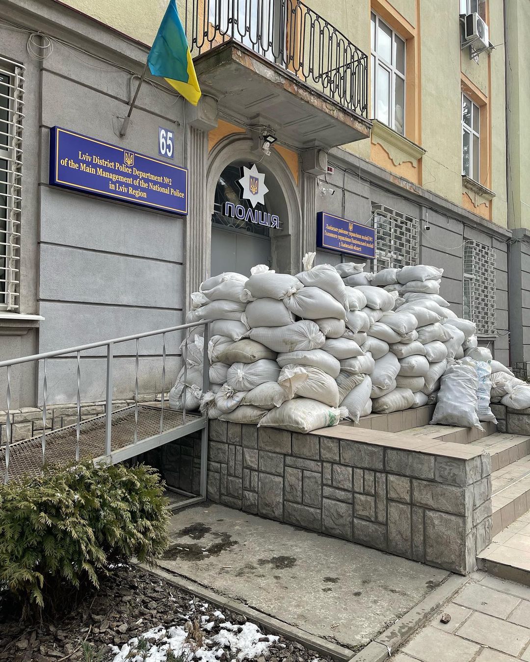 О войне напоминают и заклеенные накрест окна кафешек и части квартир, и защитная фанера на церквях и других зданиях, и маскировочные сетки-"кикиморы" для покрытия окопов, которые плетут десятки добровольцев прямо у ворот ратуши и по всему Львову.