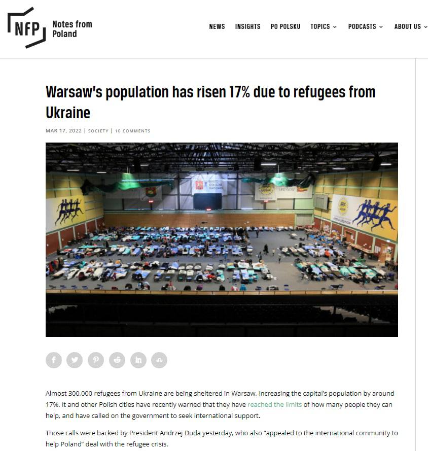 Всего в Польшу прибыли около 2 миллионов украинцев. В Варшаве и некоторых других польских городах уже предупредили, что достигли предела того, скольким людям они могут помочь, и призвали правительство искать международной поддержки.