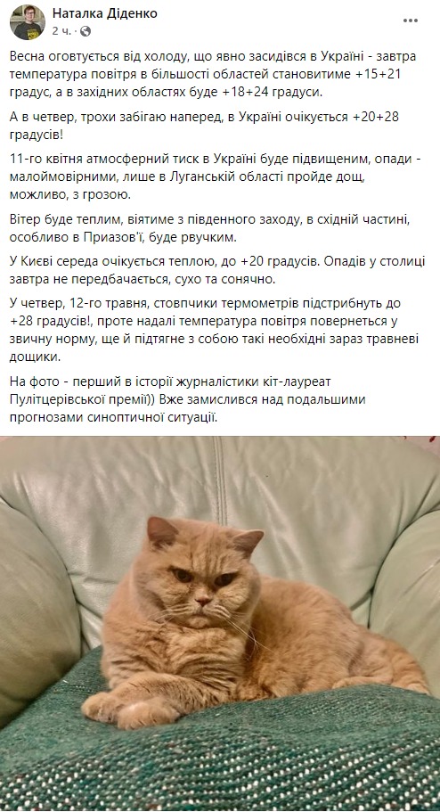 В среду, 11 мая, холодный атмосферный фронт с дождями в большинстве областей сменится на летние +15...+21 градус, а в западных областях будет +18...+24 градуса. В четверг, по ее информации, в Украине ожидается еще жарче, до +20...+28 градусов. Такой прогноз погоды передаёт синоптик Наталья Диденко на своей странице в Facebook.