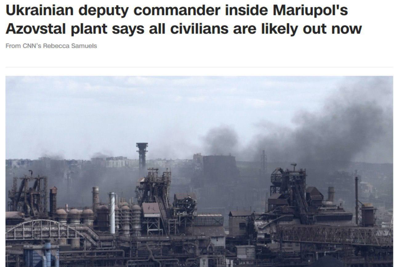 "Если вы говорите о самом заводе "Азовсталь", то гражданские лица, о которых мы знали, гражданские лица, которые были с нами, гражданские лица, о которых мы заботились, их с нами нет. Им удалось покинуть завод. Но я не могу сказать вам наверняка, может быть, есть кто-то еще дальше на территории, потому что ни одна международная организация в какой-либо момент не приезжала и не имела доступа, чтобы приехать и оценить ситуацию", — сказал Паламарь.
