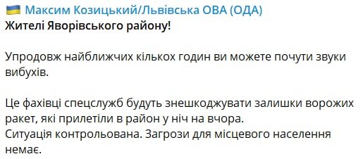 Официальной информации о природе взрывов пока нет, но несколько часов назад губернатор Максим Козицкий предупреждал, что в Яворовском районе будут обезвреживать обломки вчерашних ракет, и могут быть взрывы.
