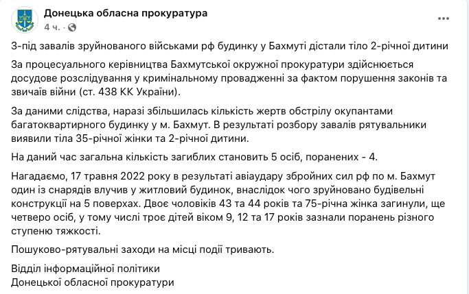 Напомним, 17 мая в Бахмуте один из снарядов попал в жилой дом, в результате чего двое мужчин 43 и 44 лет и 75-летняя женщина погибли, еще четыре человека, в том числе трое детей в возрасте 9, 12 и 17 лет, получили ранения.