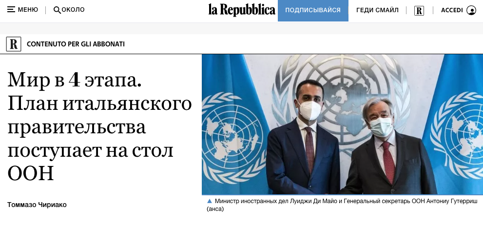 Италия разработала план прекращения войны в Украине и передала его генсеку ООН. Он подразумевает быстрое вступление Украины в ЕС, но военный нейтралитет.