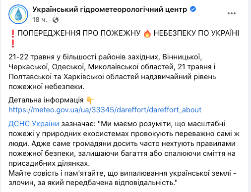 Также метеорологи предупреждают о чрезвычайном уровне пожарной опасности на выходных почти по всей стране: в большинстве районов западных областей, Винницкой, Черкасской, Одесской, Николаевской, Полтавской и Харьковской областях.
