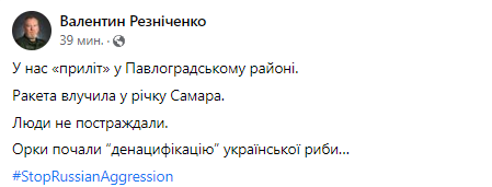 "У нас "прилет" в Павлоградском районе. Ракета попала в реку Самара. Люди не пострадали. Орки начали "денацификацию" украинской рыбы", - написал глава ОГА.