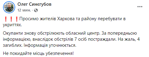 Губернатор Харьковской области Олег Синегубов обратился к жителям Харькова с призывом не покидать укрытия. В областной военной администрации уточняют, что сегодня под обстрел попал центр Харькова. Погибли четыре человека. Еще семь получили ранения.