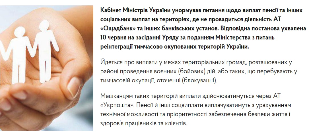 8.32 Выплаты жителям оккупированных или блокированных территорий будут осуществляться только через "Укрпочту".