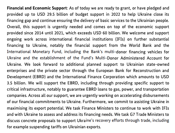 Также G7 обещает оказывать поддержку украинским государственным предприятиям и частному сектору  в размере 3,5 млрд долларов через Европейский банк реконструкции и развития и Международную финансовую корпорацию.