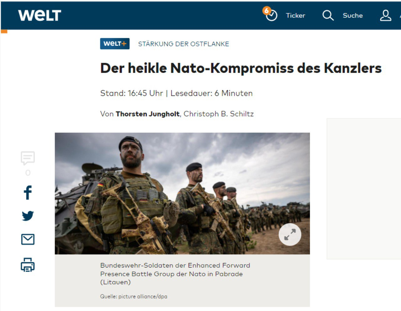 По его данным, при рассмотрении плана дополнительно отправить туда бригады по 3-5 тысяч солдат канцлер Олаф Шольц предложил компромисс – разместить на востоке только элементы штабной инфраструктуры, силы связи, амуницию и склады горючего.
