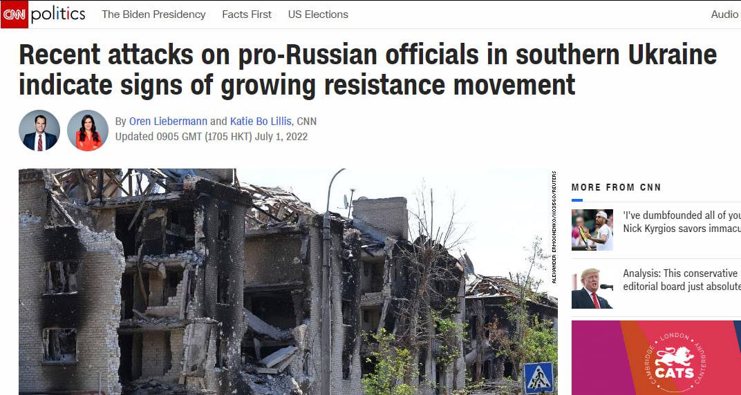 Хотя пока это лишь несколько инцидентов в городе Херсоне, официальные лица США верят, что сопротивление может перерасти в более широкую борьбу, что создаст серьезную проблему для способности России контролировать недавно захваченную территорию в Украине. Кремль "сталкивается с растущей активностью партизан на юге Украины", заявила Аврил Хейнс, директор национальной разведки.