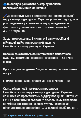 По данным следствия, 3 июля в 4 утра российские военные нанесли ракетный удар по Новобаварскому району Харькова. Вражеская ракета попала на территорию частного дома, при этом получила ранение его владелица - 54-летняя женщина.