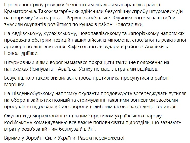 Об этом говорится в вечерней сводке Генштаба ВСУ в Facebook.