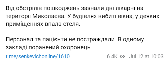Мэр города Александр Сенкевич уточнил, что от обстрелов в Николаеве повреждены две больницы. В зданиях выбиты окна, в некоторых помещениях упал потолок.