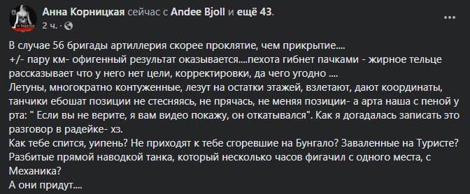 Она, в частности, указала на проблемы с точностью ударов украинской артиллерии, заявив, что "в случае 56 бригады артиллерия скорее проклятие, чем прикрытие".