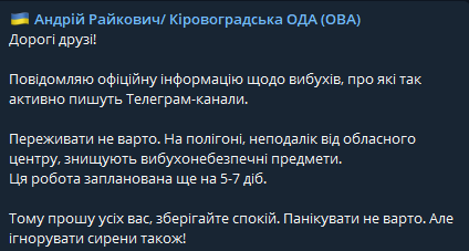 "Сообщаю официальную информацию о взрывах, о которых так активно пишут Телеграмм-каналы. Переживать не следует. На полигоне, недалеко от областного центра, уничтожают взрывоопасные предметы. Эта работа запланирована еще на 5-7 дней. Поэтому прошу всех вас, сохраняйте покой. Паниковать не стоит. Но игнорировать сирены тоже", - написал Райкович в своем Телеграм-канале.