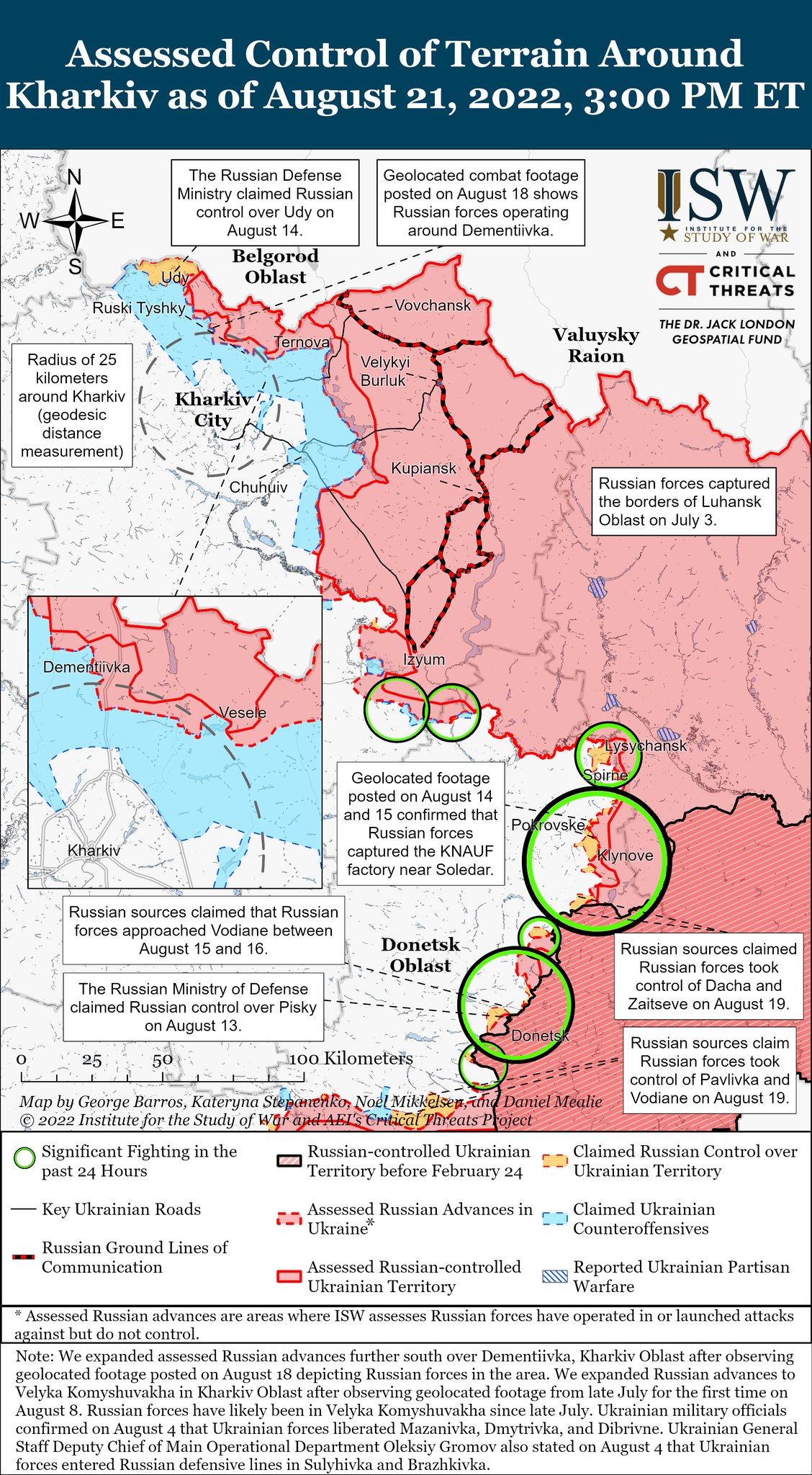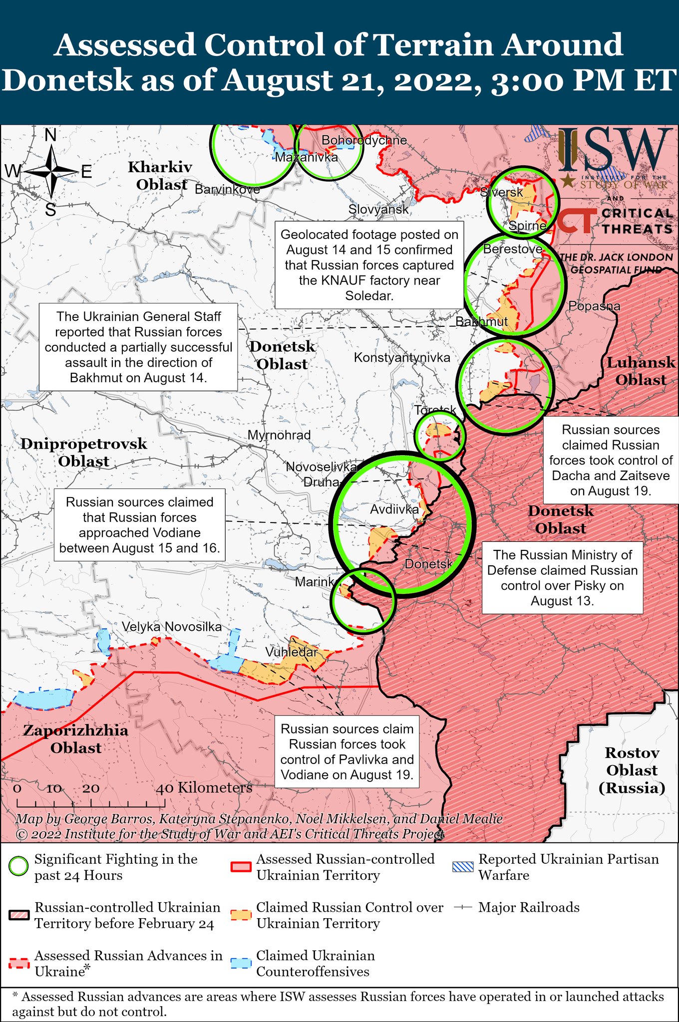 Американский Институт изучения войны 22 августа опубликовал актуальные карты боевых действий в Украине. Сообщается, что войска РФ вчера предприняли несколько неудачных наземных атак к юго-западу и юго-востоку от Изюма, также россияне атаковали к юго-востоку от Северска и к северо-востоку и югу от Бахмута