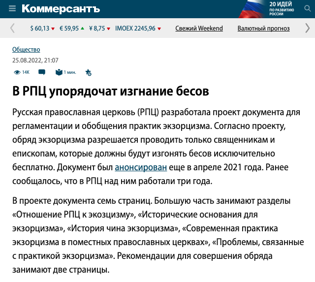 Издание отмечает, что регламентировать изгнание бесов в РПЦ решили после нескольких случаев, когда люди погибали во время процедуры.